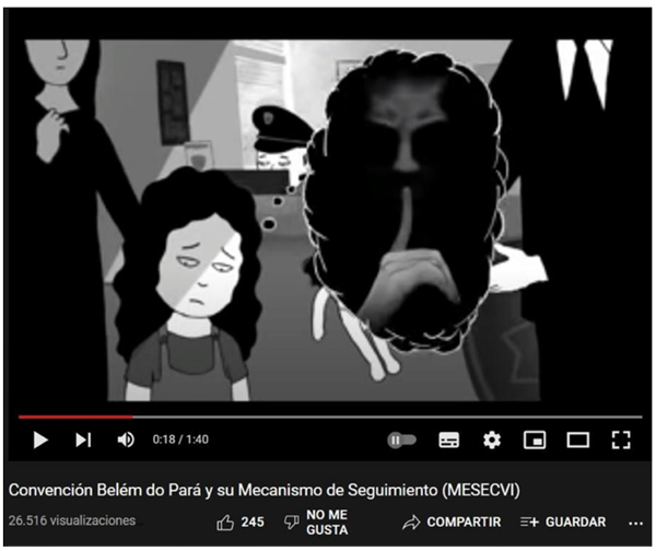 En el ámbito interamericano, en el video "Convención Belém do Pará y su mecanismo de seguimiento" (segundo 00:38), la narración dice: "revelarla y combatirla [la violencia contra las mujeres] es vital para garantizar nuestros derechos humanos y libertades fundamentales". Aquí, la idea de "revelar" alude claramente a la denuncia en sede penal, que a su vez pone en marcha el proceso. En ese video, previamente, se presenta a una niña como víctima, por lo que la necesidad de protección es clara, al tiempo que la denuncia se presenta como solución. Después aparece un foco que contiene la inscripción "Belém do Pará", que representa a la convención como un halo protector. Enseguida, una silueta roja femenina en el suelo se ilumina. La luz proviene del foco "Belém do Pará".
