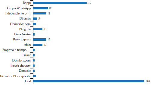 Del total de encuestados, 63 están vinculados con Rappi, 17 prestan el servicio a través de grupos de WhatsApp, 16 son independientes, 15 están vinculados con Raky, 10 trabajan con Abici, 5 trabajan con Dinamic, 10 no están vinculados con ninguna y el restante trabajan para otras plataformas o no respondieron esta pregunta.
