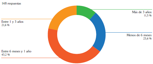 La mayoría de los domiciliarios lleva trabajando más de seis meses y únicamente el 11,5 % lleva más de 3 años laborando en este sector.