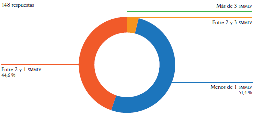 En cuanto al ingreso mensual percibido, más de la mitad recibe menos de 1 smmlv, el 44,6 % percibe entre 1 y 2 smmlv, y únicamente el 4 % más de 3 smmlv.