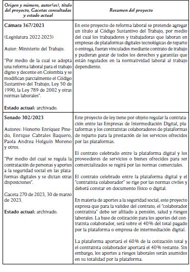 Congreso de la República de Colombia. (30 de marzo de 2023). Proyecto de Ley 302 Senado. Por medio del cual se regula la contratación de personas y aportes a la seguridad social en las plataformas digitales y se dictan otras disposiciones. http://leyes.senado.gov.co/proyectos/index.php/proyectos-ley/cuatrenio-2022-2026/2022-2023/article/317-por-medio-de-la-cual-se-regula-la-contratacion-de-personas-y-aportes-a-la-seguridad-social-en-las-plataformas-digitales-y-se-dictan-otras-disposiciones