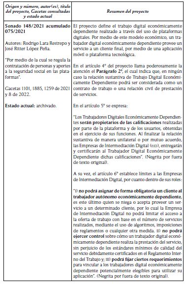 Congreso de la República de Colombia. (12 de agosto de 2021). Proyecto de Ley 148 Senado acumulado 075 Cámara. Por medio de la cual se regula el trabajo digital económicamente dependiente realizado a través de empresas de intermediación digital que hacen uso de plataformas digitales en Colombia. http://leyes.senado.gov.co/proyectos/index.php/proyectos-ley/cuatrenio-2018-2022/2021-2022/article/148-por-medio-de-la-cual-se-regula-el-trabajo-digital-economicamente-dependiente-realizado-a-traves-de-empresas-de-intermediacion-digital-que-hacen-uso-de-plataformas-digitales-en-colombia