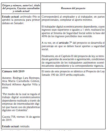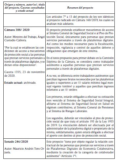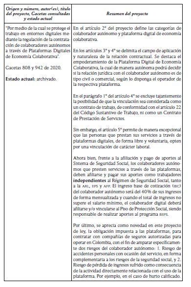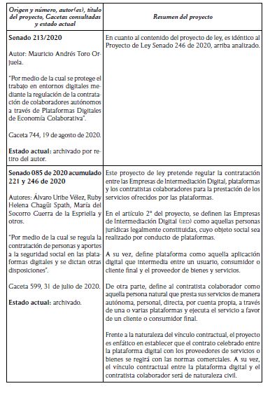 Congreso de la República de Colombia. (26 de agosto de 2020). Proyecto de Ley 246 Senado acumulado 221 Cámara. Por medio de la cual se protege el trabajo en entornos digitales mediante la regulación de la contratación de colaboradores autónomos a través de Plataformas Digitales de Economía Colaborativa. http://leyes.senado.gov.co/proyectos/index.php/proyectos-ley/cuatrenio-2018-2022/2020-2021/article/246-por-medio-de-la-cual-se-protege-el-trabajo-en-entornos-digitales-mediante-la-regulacion-de-la-con-tratacion-de-colaboradores-autonomos-a-traves-de-plataformas-digitales-de-economia-colaborativa