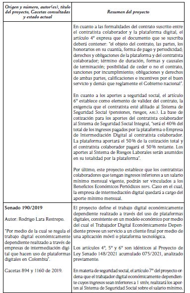 Congreso de la República de Colombia. (4 de octubre de 2019). Proyecto de Ley 190 Senado. Por medio de la cual se regula el trabajo digital económicamente dependiente realizado a través de empresas de intermediación digital que hacen uso de plataformas digitales en Colombia. http://leyes.senado.gov.co/proyectos/index.php/proyectos-ley/cuatrenio-2018-2022/2019-2020/ article/190-por-medio-de-la-cual-se-regula-el-trabajo-digital-economica-mente-dependiente-realizado-a-traves-de-empresas-de-intermediacion-digital-que-hacen-uso-de-plataformas-digitales-en-colombia
