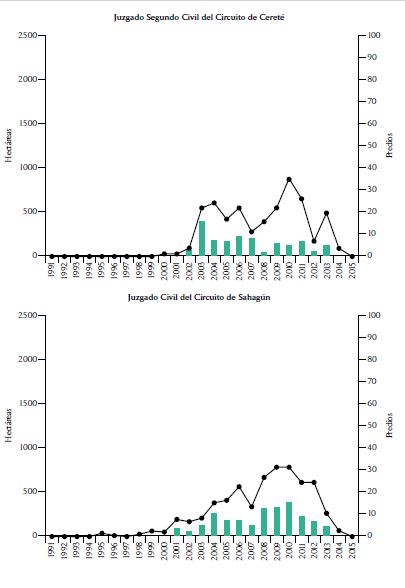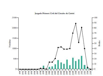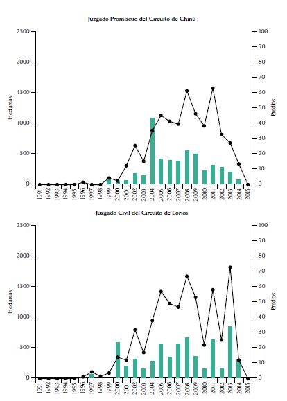 Ahora bien, la entrega judicial de baldíos no solo está concentrada en términos de su extensión y su ubicación geográfica, sino también a nivel de juzgados. De un total de 37 despachos judiciales identificados en la base JRA, 7 están por encima de 156 casos, esto es, el promedio del número de sentencias por juzgado más media desviación estándar (ver las gráficas del comportamiento anual de los 7 juzgados y la extensión de los baldíos que titularon en la sección 6 del anexo). De esos 7 juzgados, 3 profirieron más de 500 sentencias cada uno, los cuales corresponden al Juzgado Primero Civil del Circuito de Cereté (592 sentencias), el Juzgado Civil del Circuito de Lorica (585 casos) y el Juzgado Promiscuo del Circuito de Chinú (519 sentencias). En 2014, cuando la Corte Constitucional ordenó medidas estructurales en la sentencia T-488, algunos de estos juzgados tuvieron una reducción significativa del número de casos mientras que otros registraron una importante disminución incluso antes de esa fecha.