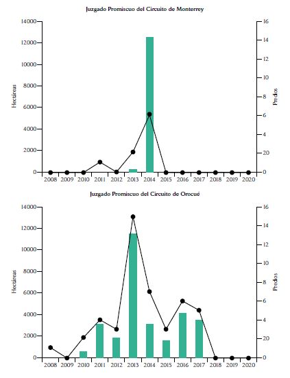 Luego, hicimos una revisión manual de todos los folios de matrícula inmobiliaria de los baldíos prescritos en Córdoba y Casanare, que son los departamentos que registran patrones de acumulación de la tierra por este desvío judicial de la reforma agraria. En total, verificamos los datos de identificación del predio y la sentencia para 3062 y 139 observaciones en Córdoba y Casanare, que suman 51.146,21 y 111.339,00 hectáreas, respectivamente. Extendimos la base hasta 2020 a partir de información periodística que fue recopilada por la Fundación Verdad Abierta.