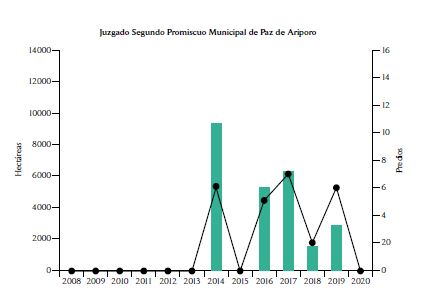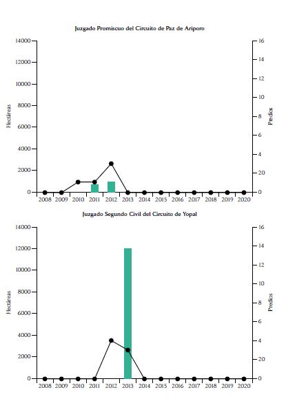 En Casanare, a diferencia de Córdoba, solo 7 juzgados entregaron baldíos a particulares. La mayoría de los predios fueron entregados por el Juzgado Promiscuo del Circuito de Orocué en 2013 y, en menor medida 2014, el Juzgado Primero Promiscuo Municipal de Paz de Ariporo en 2017 y 2018. A partir de 2014, el Juzgado Segundo Promiscuo Municipal de Paz de Ariporo representa una proporción importante del número de baldíos entregados a particulares. Durante la caída del número de casos en 2015, solamente el Juzgado Promiscuo del Circuito de Orocué tituló baldíos en medio del debate nacional sobre la entrega judicial de baldíos, que fue suscitado por la sentencia de la Corte Constitucional. En 2014, el Juzgado Promiscuo del Circuito de Monterrey tituló más de 12.000 ha concentradas en tan solo 6 predios (más de 2000 ha en promedio por predio) y, en 2013, el Juzgado Segundo Civil del Circuito de Yopal entregó 3 predios que sumaban casi 12.000 ha (promedio de unas 3990 ha por predio).