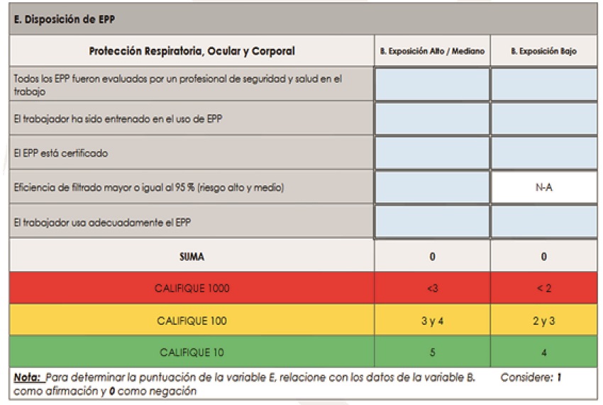 La gran mayoría de las herramientas para evaluar el riesgo de infección para COVID-19 son de enfoque individual y suelen incluir datos demográficos, edad, sexo comorbilidades. Sin embargo, para que sea una completa y correcta evaluación del riesgo biológico, debe incluirse la valoración de la potencial transmisión del SARS COV-2 en el área de trabajo. (16,17