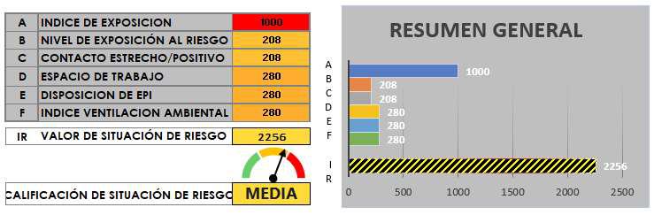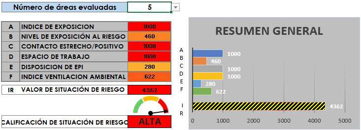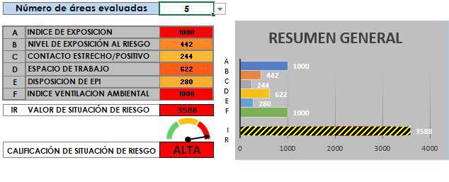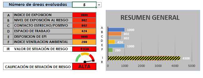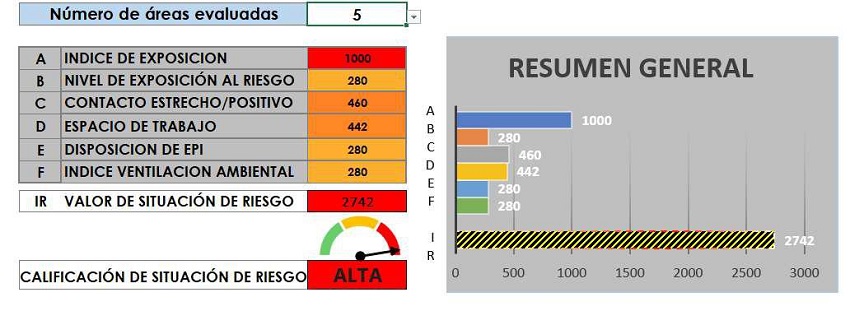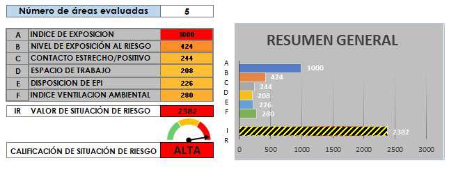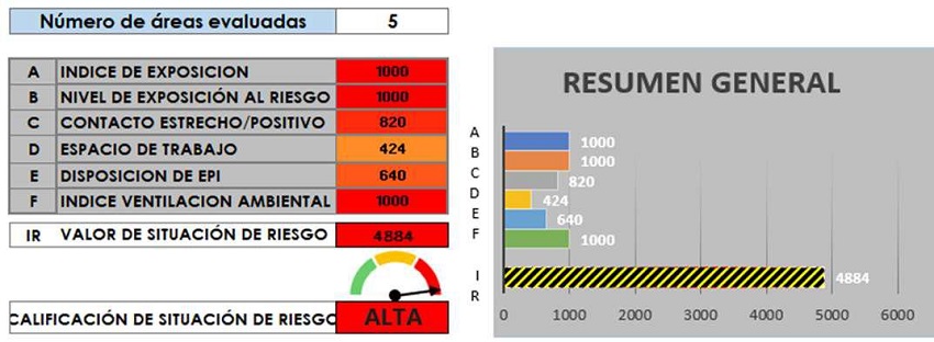 Los resultados obtenidos en este trabajo nos evidencian que el 86 % de las áreas evaluadas alcanzaron un riesgo elevado de infección para COVID-19 y un 14% tienen un riesgo moderado, no encontrándose áreas de bajo riesgo.