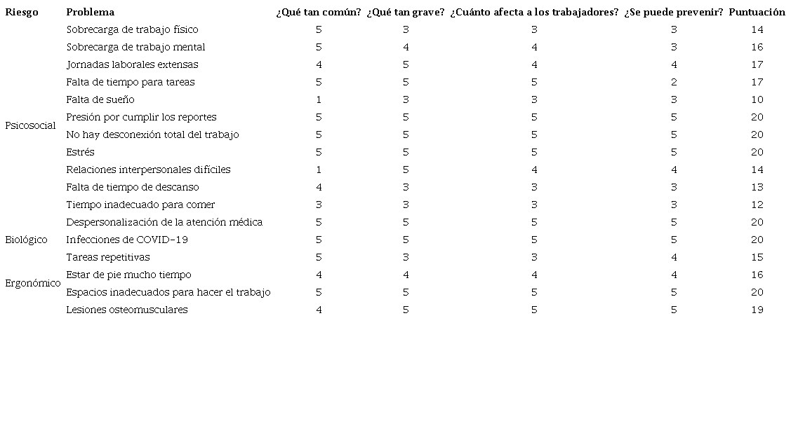 Results: The main problems reported in the self-diagnosis were: stress, high risk of becoming infected with COVID-19, depersonalization of medical care, and musculoskeletal injuries, among others. The working conditions and environment were ranked and prioritized from the perspective of the workers and their solution proposal.