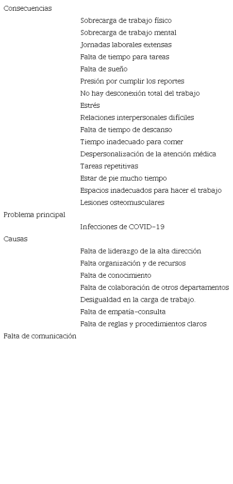 Se retroalimenta los aspectos tratados en la reunión anterior para que los nuevos integrantes se alineen a la mecánica del proceso participativo, el grupo consideró que el problema central son las infecciones por COVID-19 del cual se desprenden las condiciones de seguridad y salud laboral nocivas, presentes previo al COVID-19, pero durante la pandemia se agudizaron. En la Tabla 4, se resume la aplicación de técnica del árbol de problemas.