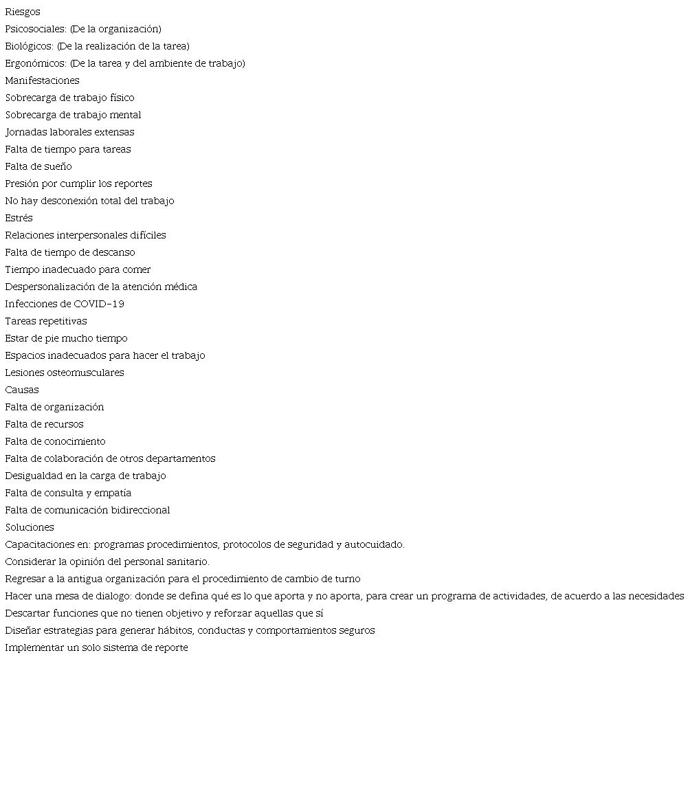 Resultados: Los principales problemas reportados en el autodiagnóstico fueron: estrés, alto riesgo de infectarse de COVID-19, despersonalización de la atención médica y lesiones osteomusculares entre otros. Se jerarquizó y priorizó las condiciones y medio ambiente del trabajo desde la perspectiva de los trabajadores y su propuesta de solución.