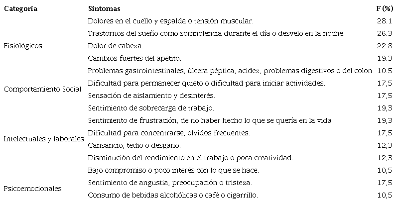 La Tabla 2 muestra los síntomas fisiológicos, de comportamiento social, intelectuales y laborales, y psicoemocionales relacionados con el estrés que presentan los ciclistas con mayor frecuencia.