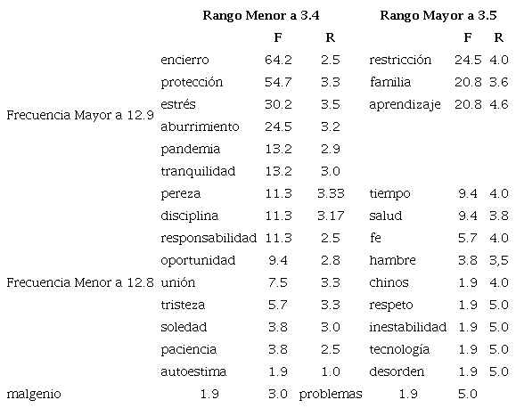 Se incluyeron palabras evocadas por al menos dos participantes; obteniéndose el prototipo de las representaciones sociales con los elementos hipotéticamente centrales, aquellos más frecuentes y evocados en los primeros lugares de la lista de palabras asociadas. En la Tabla 5 se muestra el prototipo (frecuencia por rango de evocación) de las representaciones sociales de confinamiento en los ciclistas profesionales.