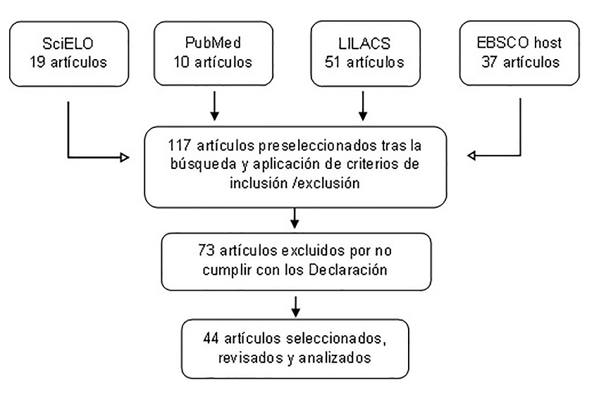 A partir de la búsqueda realizada, se hallaron en su totalidad 44 artículos que abordan la temática de fatiga laboral en contextos hospitalarios (Figura 1), además, se identificaron 9 de los 44 artículos duplicados, de los cuales 8 se repitieron entre las bases de datos LILACS y SciELO y 1 entre LILACS y PubMed.