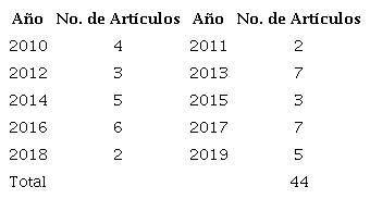 En la Tabla 1, se presenta el número de artículos hallados por cada año, cabe resaltar que el año que reunió más estudios relacionados con la fatiga laboral fue el 2010.