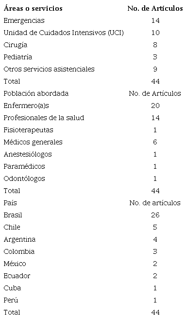 En la Tabla 2 se presentan las Áreas, servicios asistenciales y población abordada en los artículos, así como los 44 artículos analizados respectivamente