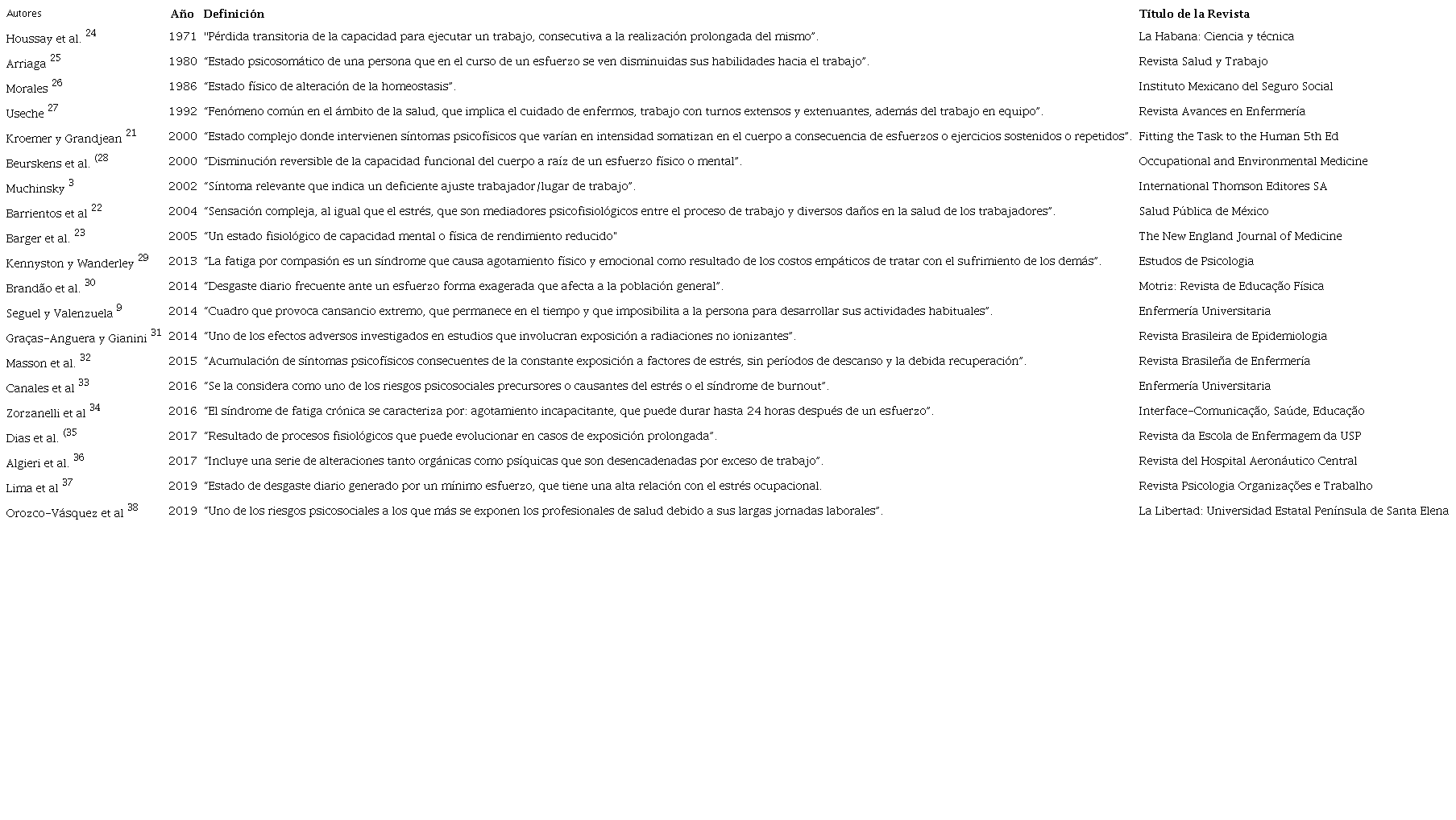 El 45% (n= 20) de los artículos contienen una definición explicita de la fatiga laboral. En estos, se evidencian diferencias marcadas entre cada definición, algunos hacen alusión a la “fatiga por compasión” y su relación con el “agotamiento emocional” las cuales surgieron como categorías emergentes para el presente estudio. cabe señalar que, no se repitieron o se citaron los mismos autores, lo que evidencia la diversidad conceptual de este término. Se resaltan similitudes en las definiciones como las de Kroemer y Grandjean, 21 Barrientos, Martínez y Méndez et al. (22, y Barger et al. 23, (Tabla 3) al definirla como un estado fisiológico con síntomas psicofísicos donde las habilidades de la persona se ven disminuidas afectando sus actividades habituales. Nosotros nos adherimos al concepto de Canales et al. 33, puesto que distingue la fatiga laboral del síndrome de Burnout, al considerar al primero como un estado precursor o causante del segundo y no como conceptos equivalentes.