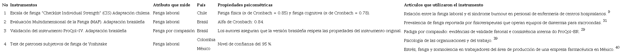 Se identificaron cuatro instrumentos empleados exclusivamente para medir la fatiga laboral, se excluyeron aquellos que involucran indicadores propios del burnout o que no tuviesen un enfoque específico en medir la fatiga laboral. Ahora bien, tal como se muestra en la Tabla 4, uno de los instrumentos más utilizados fue el test de patrones subjetivos de fatiga de Yoshitake (1978), que fue empleado en Colombia 39 y México, 40 sin embargo, este instrumento no está destinado para los profesionales de la salud, sino para los colaboradores en cualquier contexto laboral. Para efecto del presente estudio, se recomienda el Checklist Individual Strength (CIS) el cual es considerado como uno de los instrumentos más acertados para medir la fatiga laboral señalando una consistencia interna entre 0.84-0.95 y una fiabilidad (test-retest) de 0.74-0.86. Al respecto Worm-Smeitink et al. 41, afirmaron que este es una herramienta válida y confiable para la evaluación de la fatiga desde el marco físico y cognitivo, razón por la que, se utiliza en la práctica clínica al reconocer la distinción de ésta con otras patologías, además de su amplia difusión en diferentes idiomas.