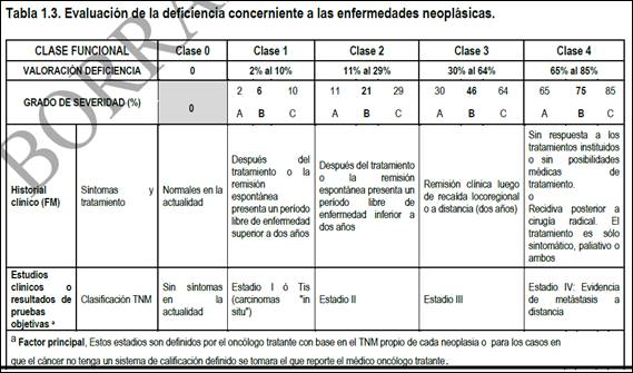En el Capítulo I del borrador del MUCPCLO 2021, la Tabla 1.3 expone la evaluación de la Deficiencia concerniente a las Enfermedades Neoplásicas (Figura 1). El Factor Principal (FP), son los estadios son definidos por el oncólogo tratante con base en el sistema TNM (Tumor (T), Nódulo (N) y Metástasis (M)) propio de cada neoplasia o para los casos en que el cáncer no tenga un sistema de calificación definido se tomará el que reporte el médico oncólogo tratante. Sin embargo, no aclara cuál debe ser el TNM que debe ser utilizado en el momento de la calificación, si el TNM al momento del diagnóstico, o el TNM después de haber concluido el tratamiento. En los procesos de calificación de PCL, lo que se busca es evaluar el estado del paciente al momento de la calificación, por lo que es necesario utilizar el TNM correspondiente al estadio del cáncer en dicho momento y no en el momento del diagnóstico. Puede que para las personas conocedoras de la normatividad sea entendible que el TNM debe ser el último registrado por el oncólogo, una vez finalizado el proceso de rehabilitación integral o se hayan superado los 540 días de haber sido diagnosticada la enfermedad. Se decidió realizar este comentario, pensando en la población del común o no conocedora de la interpretación de las normas, para que la norma sea más especifica en su contenido para que no quede abierto a interpretaciones erróneas.
