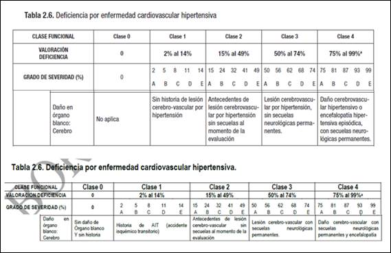 Results: It does not take into account the conceptual advance of the WHO, where it moves from ICD-10 to ICD-11 in 2019. It introduces the possibility of presential assessment or telemedicine (Resolution 2654 of 2019). Regarding the deficiencies, it does not clarify which TNM should be used at the time of the qualification, whether it is at the time of diagnosis, or after having concluded the treatment. In respiratory system impairments, it gives priority to the results of objective functional tests complemented with clinical criteria. In the assessment of chronic pain, the subjective VAS scale continues to be used, which may allow the inclusion of simulation or exaggeration variables. In the evaluation of impairments due to mental disorders, it is performed with the DSM-IV, which can have great clinical repercussions and value in the qualification.