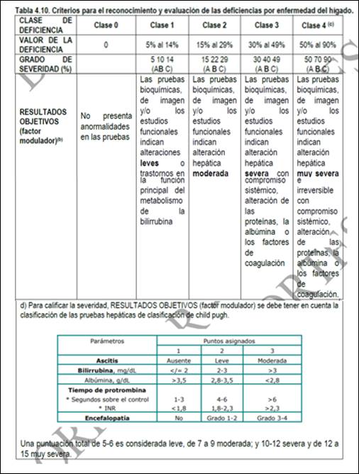 Es válido dar una apreciación positiva a los Capítulos II y V. En el primero, la deficiencia por enfermedad cardiovascular hipertensiva se presenta en la Tabla 2.6, de la cual llama la atención el FP “daño en órgano blanco: cerebro” dado que se realizó un cambio significativo en la gradualidad en las secuelas de las diferentes clases funcionales. En el MUCPCLO 2014, la clase 1 a la 3 es prácticamente la misma (persona sana a nivel neurológico) y la clase 4 se le asigna a una persona con secuelas neurológicas permanentes sin importar su intensidad y extensión (Figura 4). La Tabla 4.10 presenta los Criterios para el reconocimiento y evaluación de las deficiencias por enfermedad del hígado, en el Capítulo IV del borrador del MUCPCLO, donde adicionan el grado de severidad (Figura 5) y se debe tener en cuenta la clasificación Child-Pugh, publicada en 1964, para evaluar pronóstico en los pacientes cirróticos que eran sometidos a cirugía de shunt para aliviar la hipertensión portal. Se ha convertido en una herramienta de uso controvertido para evaluar severidad en pacientes con cirrosis hepática, permitiendo desarrollar trabajos de investigación basados en ese proceso inflamatorio y el compromiso de órganos. 26,27