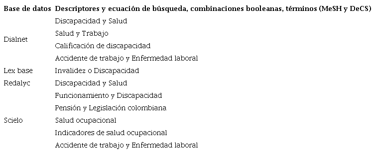 Se realizó una revisión de información en fuentes tales como bases de datos especializadas, publicaciones oficiales, para conocer las normas relacionadas con el funcionamiento, la deficiencia, la calificación de invalidez y la discapacidad, tomando en cuenta palabras clave y ecuaciones de búsqueda (Tabla 1).