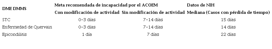 En la Tabla 1 se presenta un ejemplo de los tiempos esperados de incapacidad según las modalidades de intervención laboral en patologías por desórdenes musculo esqueléticos de miembros superiores y su injerencia con la incapacidad temporal.