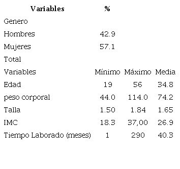 La Tabla 1 muestra las variables demográficas. La proporción de hombres fue mayor que la encontrada en las mujeres. La edad presentó una media de 34.8 años. El IMC promedio establecido fue de 26.9 la cual corresponde a un grado de sobrepeso y obesidad Grado I en los sujetos evaluados, que se corresponde al peso corporal promedio presentando (73.8 kg).