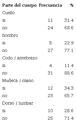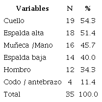 La principal afectación dolorosa de los trabajadores, se encontró en el cuello y espalda alta, le sigue la región de la muñeca/mano y el hombro (Tabla 2)