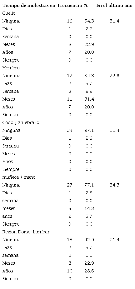 En la Tabla 3 se muestran los resultados del tiempo en que aparecieron las molestias presentadas por los sujetos evaluados. En las 5 regiones del cuerpo en que se establecieron molestias, la mayor frecuencia encontrada fueron molestias durante meses y años para molestias en cuello, muñeca/mano y la región dorso- lumbar, mientras que las molestias en hombro fueron de semanas y meses y del codo durante días. Adicionalmente se puede observar en la Tabla 3 que en el último año la mayor prevalencia de molestias se presentó en la región dorso-lumbar y la muñeca/mano. Estas molestias se presentaron en el último año, principalmente en la región dorso-lumbar y el cuello (Tabla 3).