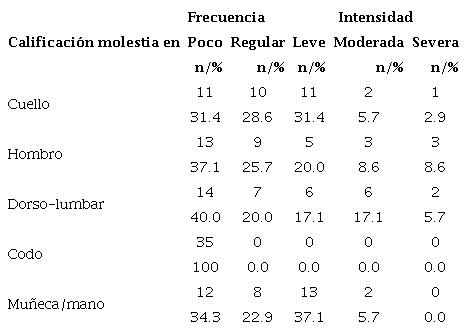 En todos los casos, los trabajadores manifestaron que la frecuencia de las molestias se presentó en el rango de poca (entre 31-40%) y en el rango de regular (entre 0.0-28.6%). La intensidad más frecuente fue la de leve (0.0-37.1%) y la menor severa (0.0-8.6%) (Tabla 4). Si tenemos en cuenta el número de trabajadores con molestias entre leve, moderada y severa, tenemos: 40% de trabajadores con molestia en el cuello y dorso-lumbar, 37% en hombro y 43% en muñeca-mano. Valores importantes en la salud ocupacional de esta empresa.