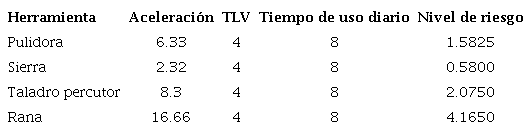 Los resultados destacaron aspectos importantes en términos de valores de exposición que deberían considerarse para prevenir el riesgo del Síndrome de Vibración de Mano-Brazo al que están expuestos los operadores que utilizan con frecuencia estas herramientas. De las cinco herramientas a las cuales se le realizaron las mediciones tres presentaron niveles altos de vibración y una herramienta (sierra) arrojo niveles por debajo de los TLV, presentando niveles de vibración moderado, según lo establecido en la Res. 2400/1979. 6
