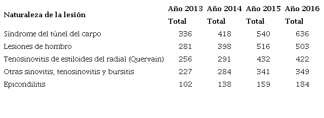 A continuación, se presentan los datos de enfermedades de trabajo por alteraciones musculoesqueléticas en las memorias estadísticas del Instituto Mexicano del Seguro Social con base en la CIE-10 (Tabla 1).