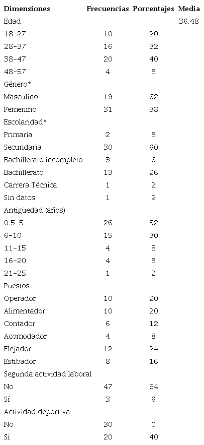 En la Tabla 2 se muestra la frecuencia de las variables sociodemográficas y laborales de la población estudiada donde el rango de edad de los participantes estuvo entre 18-57 años, con un promedio 36.5, en su mayoría del género femenino (62 %), la antigüedad laboral se encontró en un rango de 6 meses hasta 25 años en el mismo puesto, el 60 % de la población contaba con secundaria, el puesto que predominó en el estudio fue el de flejador y el 94% de la población refirió no contar con una segunda actividad laboral.
