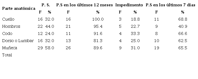 Moran et al. 10, mencionaron que el hecho de las altas prevalencias encontradas en el último año sean similares a las encontradas en la última semana indica que estos síntomas pueden corresponder a patologías instauradas, en éste estudio el 91.6% de la población con sintomatología positiva tuvo molestias en el último año y de éstas el 69.8% refirió haber presentado sintomatología en la última semana, éstas prevalencias son altas y pueden significar que los trabajadores ya cuentan con patología musculoesquelética.