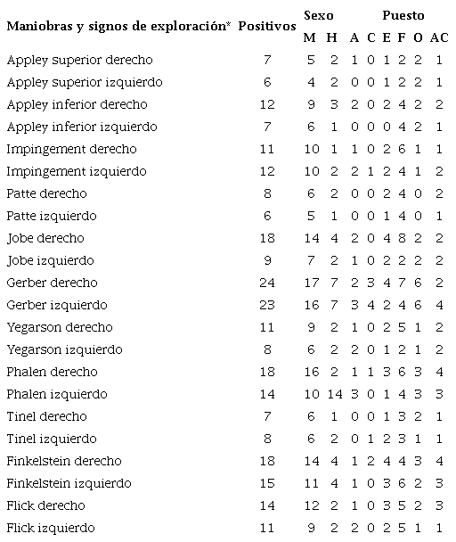 La exploración de maniobras y signos específicos para la determinación de lesiones de extremidad superior, se presenta en la Tabla 4, donde se observa que la maniobra de Gerber fue positiva en extremidad derecha e izquierda en 24 y 23 trabajadores respectivamente, seguida de la maniobra de Jobe en extremidad derecha con 18 detecciones positivas, signo de Phalen derecho con 18 casos y Phalen izquierdo con 14, Finkelnstein derecho con 18 casos y Finkelnstein izquierdo con 14. Tambien se observa que en el género femenino fue en el que predominaron las detecciones positivas en las maniobras y signos y para los puestos de trabajo, fue en el de flejadora en el que se encuentran más casos positivos, para las maniobras ya mencionadas.