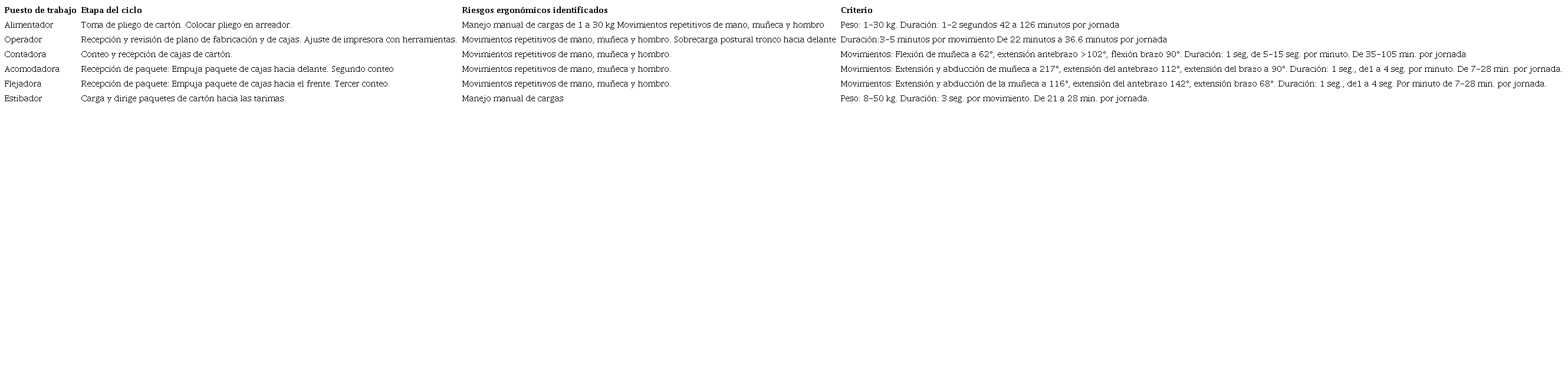 En la Tabla 5 se muestra el análisis por puesto de trabajo y la jerarquización de los riesgos ergonómicos, así como los criterios que se utilizaron para seleccionar el más pernicioso.