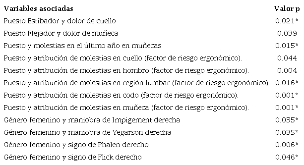 En la Tabla 6 se hace mención de las variables que estadísticamente se relacionaron positivamente. Para los puestos de trabajo, el de estibador y el de flejador se relacionaron con dolor de cuello y muñeca respectivamente, para la variable de la atribución del dolor se les preguntó a los trabajadores que en caso de que lo atribuyeran a trabajo indicaran uno de los dos factores de riesgo ergonómicos detectados en el área, todos los segmentos corporales se relacionaron positivamente con la atribución de molestias por factor de riesgo ergonómico y el género femenino se relacionó con las maniobras y signos específicos de Impigement, Yegarson, Phalen y Flick.