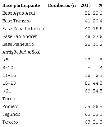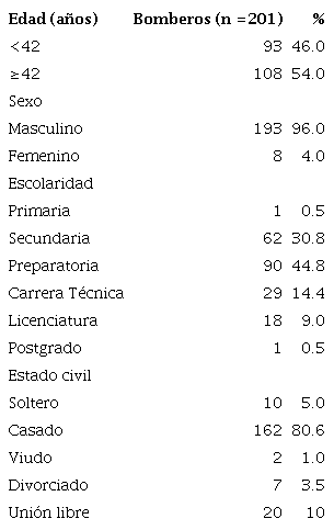 En el estudio participaron un total de 201 bomberos operativos, la edad promedio fue de 42 años (DE ±6.8 años); el 96% fueron hombres; el 30.8% tenían secundaria, 44.8% preparatoria; 80.6% estaban casados y 5% solteros (Tabla 1).