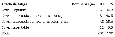 Conclusion: We found a high fatigue level, at three levels: Inadequate level with advised actions, Inadequate level with priority actions and unacceptable level. Fatigue will cause a functional limitation, a low performance and perhaps making bad decisions, which in this population could be catastrophic from the social, labor and personal point of view. It is recommended to generate interventions based on a preventive vision of labor fatigue in firefighters, to achieve an adequate control or a reduction of its incidence, taking into account the needs and resources available in this population.