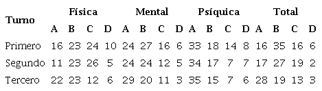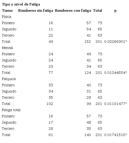 En cuanto a la distribución entre nivel de cada tipo de fatiga y turno, podemos observar que para los bomberos que trabajan en cualquiera de los tres turnos, la fatiga predominante en nivel inadecuado e inaceptable fue la física, mientras que la encontrada en nivel adecuado de manera predominante fue la psíquica, también para los tres turnos (Tabla 4).