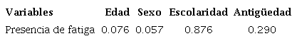 Con el fin de realizar un análisis bivariado, se agrupó a los bomberos en dos grupos de acuerdo con el nivel de fatiga, clasificándolos como adecuado y no adecuado, a partir de las categorías que da el instrumento, conjuntando los resultados de fatiga en nivel inadecuado con acciones aconsejadas, inadecuado con acciones prioritarias e inaceptable como no adecuado y los niveles aceptables como adecuado. El análisis entre fatiga y edad, sexo, escolaridad y antigüedad, se presenta en una primera tabla conjunta, en base a que, como podemos observar, en ninguno de estos cruces se encontró una relación estadísticamente significativa entre las variables (Tabla 5).