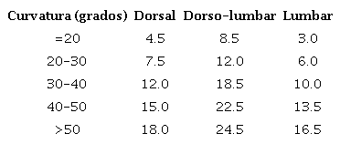 Existe poca evidencia objetiva para afirmar que la actividad deportiva o física sea dañina para los pacientes con escoliosis, con la posible excepción de algunos casos inmediatamente después de la cirugía o casos de otra patología subyacente. 35) Sin embargo, se considera puede genera insuficiencias en el desempeño de actividades en la forma o dentro del margen que se considera normal. La razón principal es el deterioro funcional y el dolor de espalda. La magnitud, gravedad y repercusiones sistémicas de la escoliosis, dependen de la intensidad de sus curvaturas. La deficiencia por este concepto se indica en la Tabla 1. (36