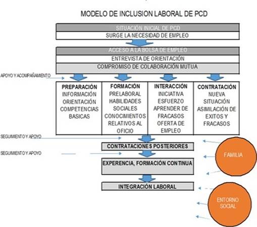 Conclusions: The labor inclusion of PCD has been working with purely vertical models without taking into account cross-cutting elements such as the accompaniment that must be done from the beginning of the inclusion and with continuous follow-up to ensure the good result of the link, in addition it is very important the participation of the family and the recognition of the social environment.