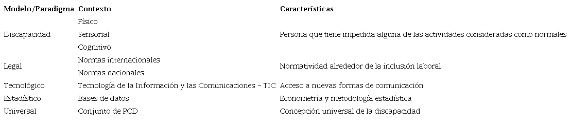 Para el caso Modelo/Paradigma/Discapacidad se realizaron una serie de comparaciones, se seleccionaron un total de seis artículos, dos por cada tipo discapacidad según normatividad colombiana: física, sensorial y psíquica, que permitieron entorno al origen de la discapacidad analizar ventajas y desventajas.