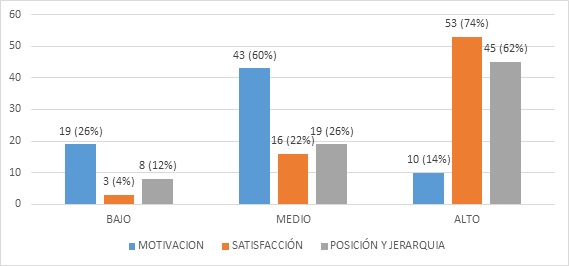 Se valoró la motivación, satisfacción, posición y jerarquía en el trabajo mediante el test de Motivación y Satisfacción Laboral,10 encontrando los siguientes resultados: Los trabajadores indicaron en referencia a la dimensión de motivación, resultados distribuidos de la siguiente manera: 26% (19) baja motivación, 60% (43) medianamente motivados y 14% (10) con una alta motivación. La cual hace referencia al entusiasmo del trabajador con relación al ambiente laboral.