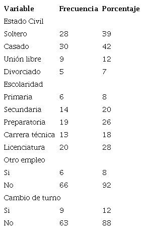 Participaron en el estudio 72 trabajadores de una población de 95 personas. El 64% (46) fueron del sexo masculino. La edad media de los participantes fue de 35 años, ±12.7. El estado civil predominante fue casado (42%/30) participantes, seguido de los solteros (38%/28). La escolaridad predominante fue licenciatura (28%/20). (Tabla 1)