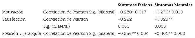 Del análisis inferencial de la correlación entre motivación, satisfacción, posición y jerarquía con los síntomas de estrés físicos y mentales, se utilizó el estadístico r de Pearson, obteniendo los siguientes resultados: Se identificó una correlación débil e inversa entre las dimensiones de motivación y satisfacción con síntomas físicos y mentales de estrés. Así como una correlación modera e inversa con la dimensión de posición y jerarquía con síntomas mentales de estrés teniendo un valor de p= 0.000 (Tabla 2).