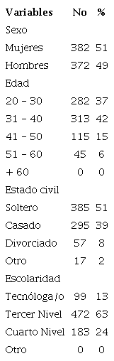 Se encuestó a un total de 735 docentes, de estos 382 fueron hombres (51%) y 372 mujeres (49%). La edad del grupo femenino entre 25 y 57 años, media ± desviación estándar (DE)= 52.4 ± 10.8, y la de los hombres entre 25 y 61 años media ± DE= 49.0 ± 10.4. (Tabla 1).